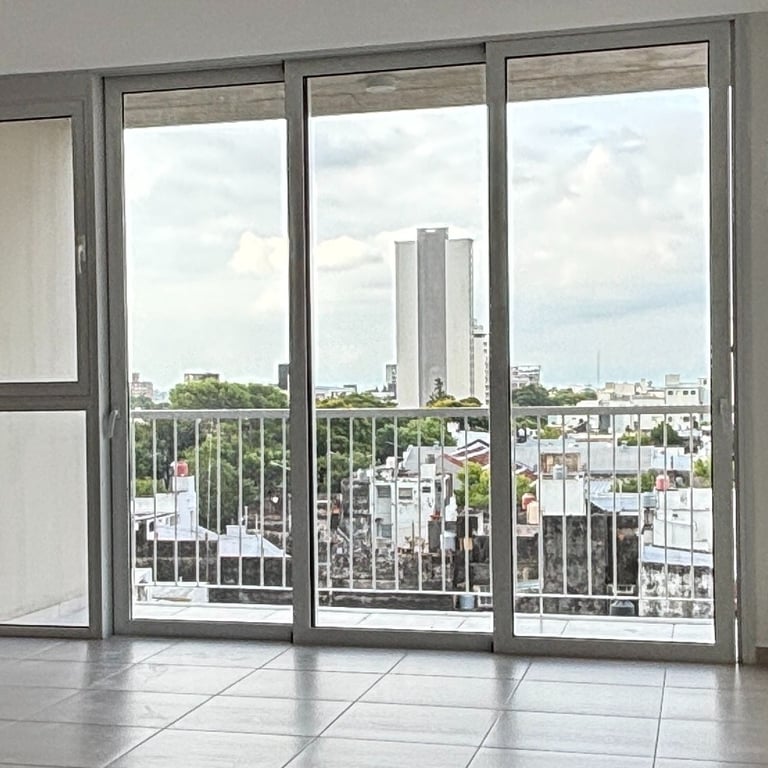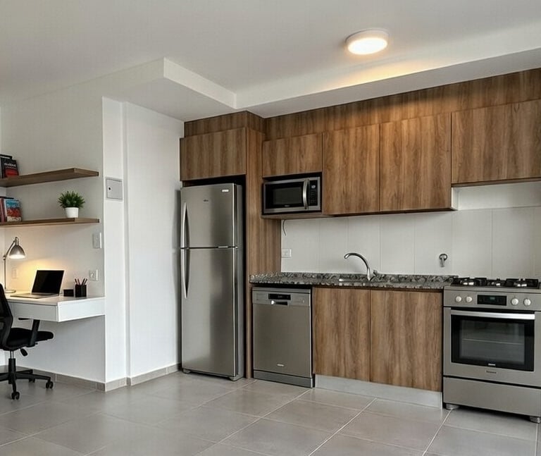 La unidad a estrenar cuenta con un ambiente principal de concepto abierto con living-comedor-cocina (amoblamiento completo y cocina con horno incluida) con acceso al amplio balcón al frente, dividido mediante paneles de vidrio piso-techo apilables en un costado. Está diseñada para agregar un sector de escritorio/home office en una de sus paredes con nicho.