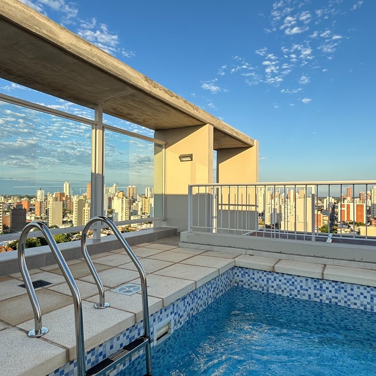 El edificio posee SUM con parrillas en el último piso y una piscina panorámica con vistas espectaculares de la ciudad.
